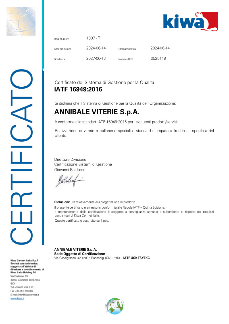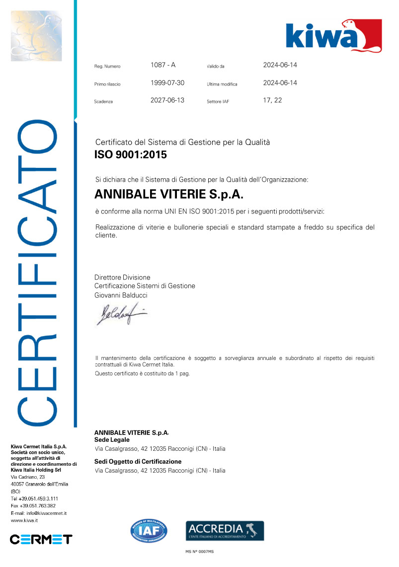 La QualitàLa politica che da sempre caratterizza l’Annibale Viterie è quella della Qualità, che oltre a soddisfare le prescrizioni delle norme UNI EN ISO 9001:2015 e ad aver ottenuto la certificazione IATF 16949:2016, va intesa come concetto principe applicato in ogni singolo momento del processo produttivo. Vengono periodicamente definiti obiettivi di miglioramento e i corrispondenti programmi attuativi vengono applicati stimolando il contributo creativo di tutti i dipendenti. I laboratori di analisi sono dotati di strumentazione all’avanguardia, che assicura un’adeguata e veloce gestione delle non-conformità e consente inoltre di effettuare controlli mirati alle specifiche richieste ed agli specifici parametri dei singoli clienti. I nostri punti di forza sono:
